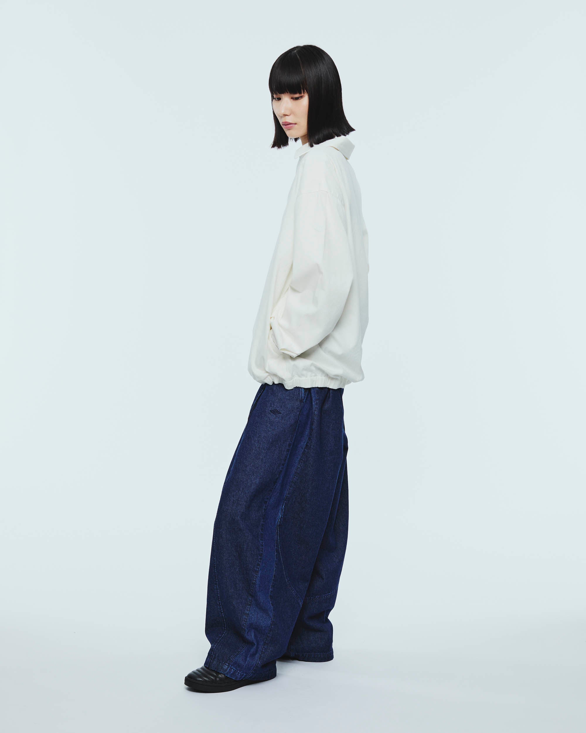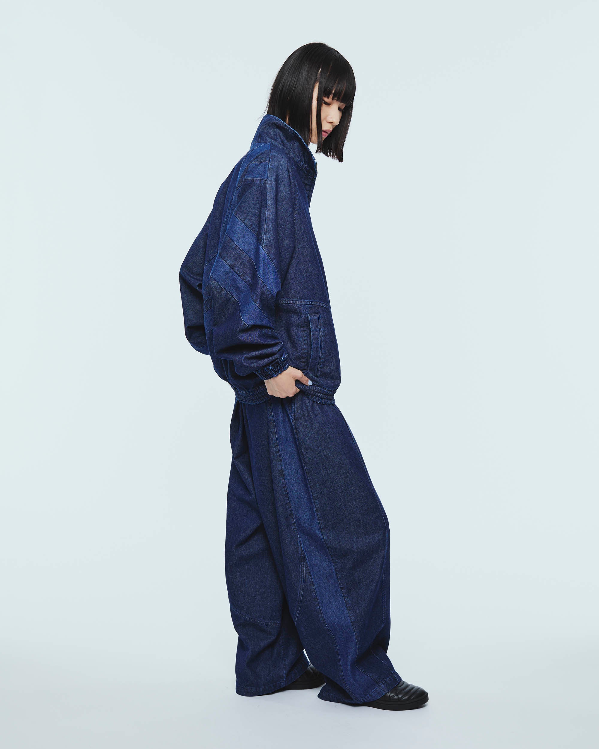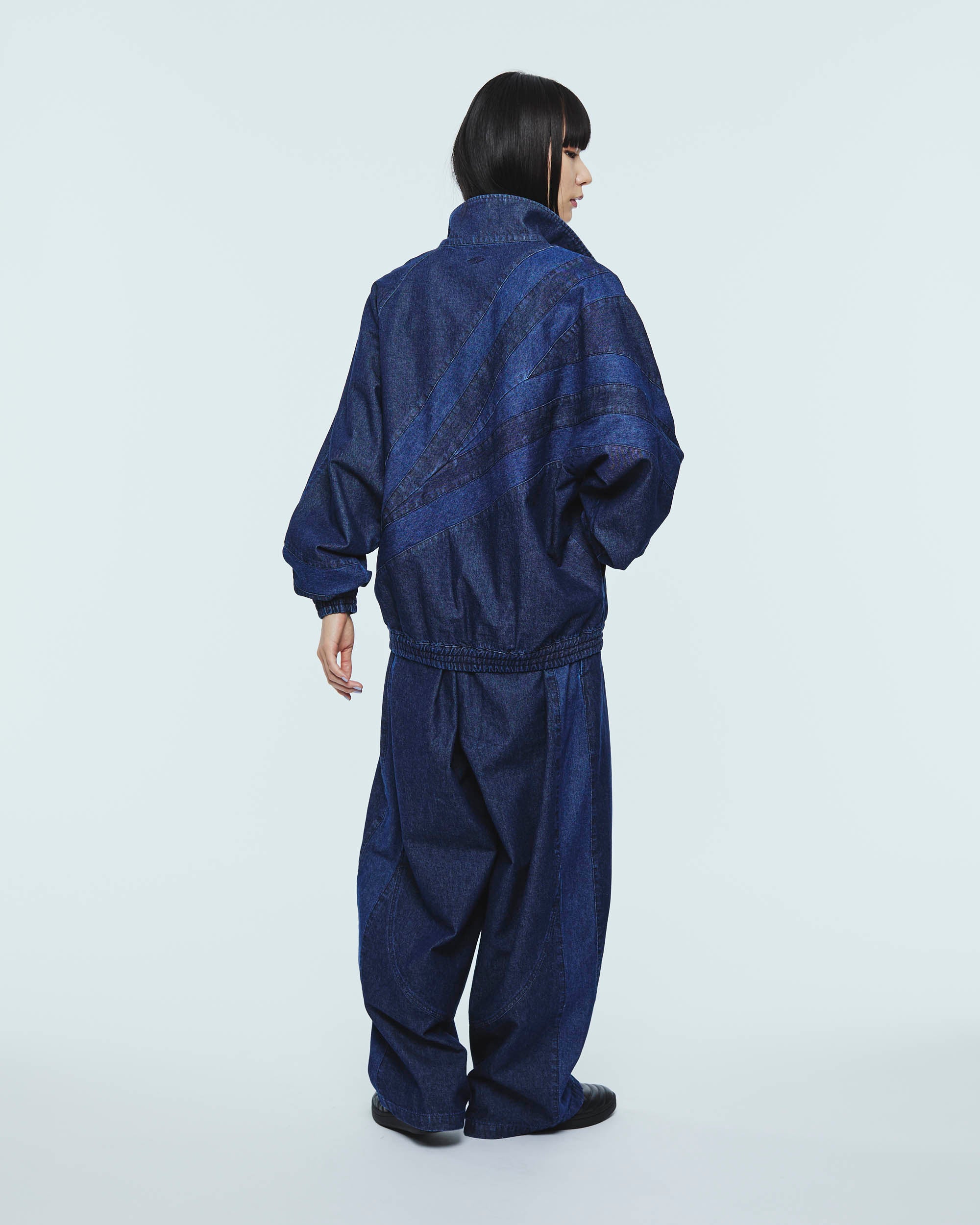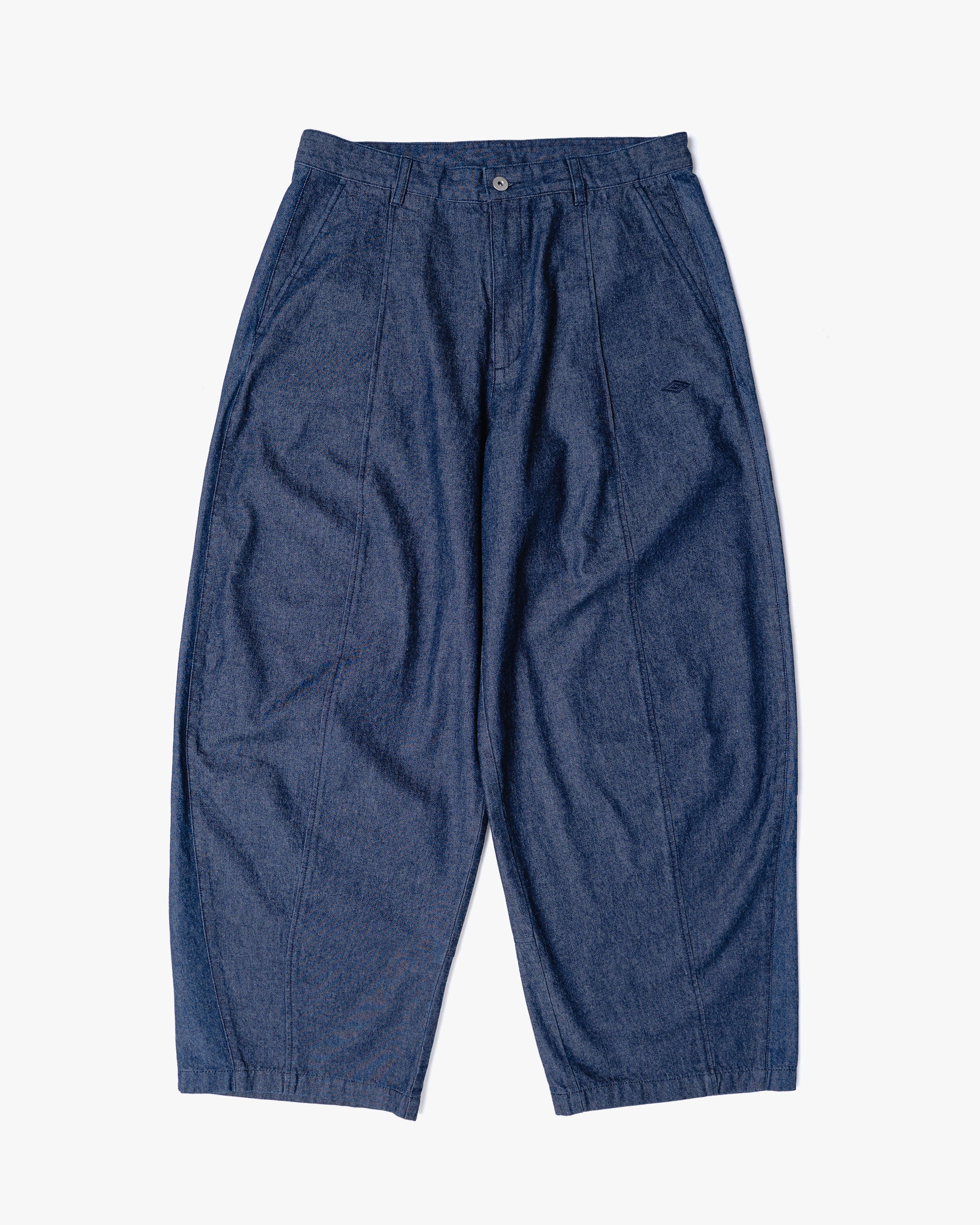 トレーニングパンツのカッティングから着想を得たデニムパンツ。腰から膝にかけて緩やかに膨らみを持たせた独特のシルエットが、スポーティさと程よい抜け感を演出する一着です。