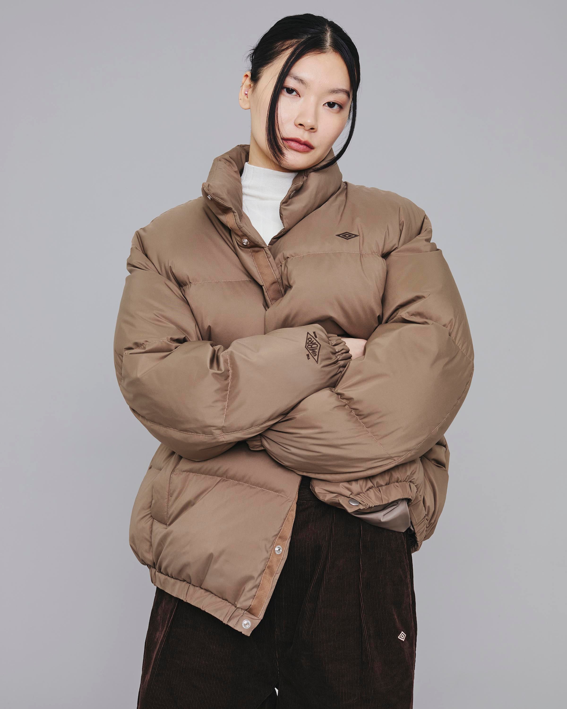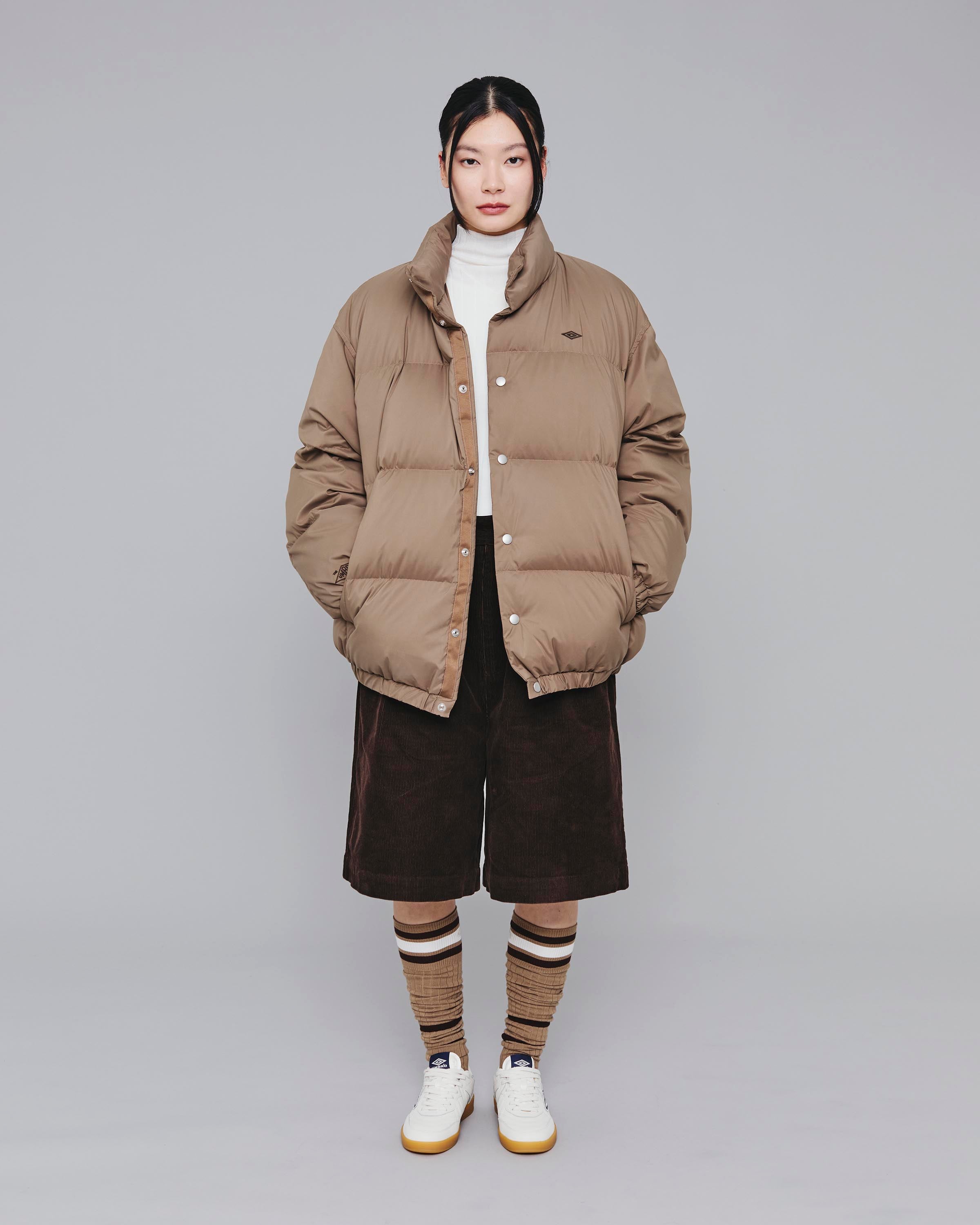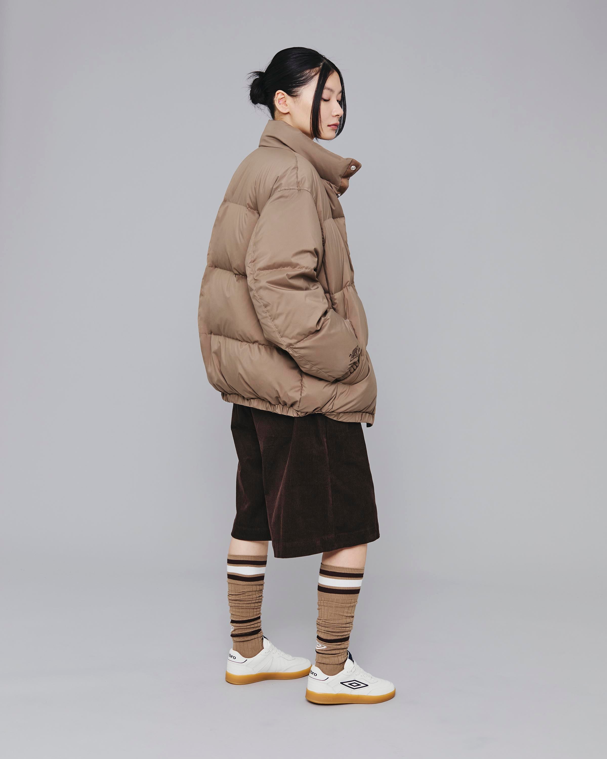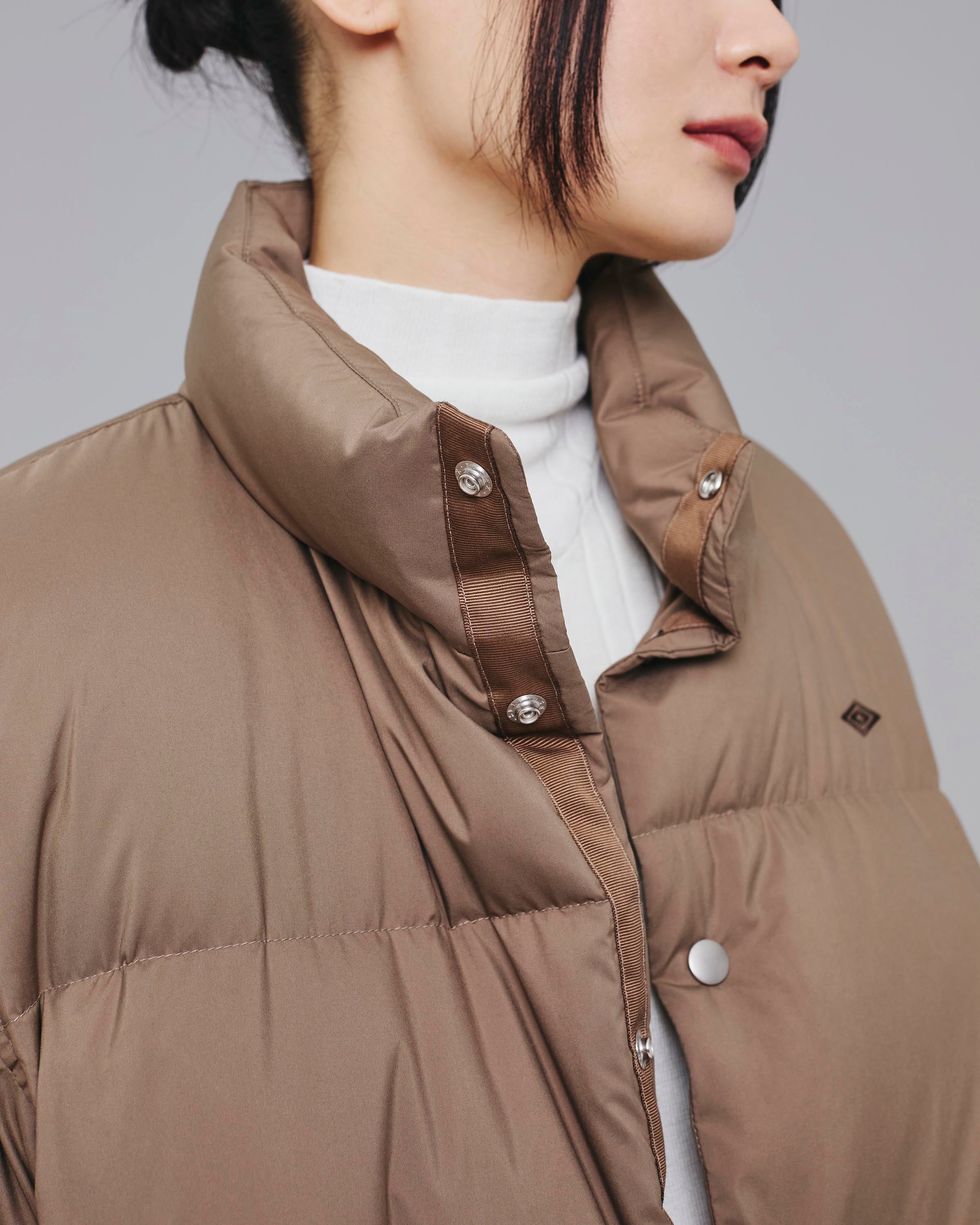 贅沢にダウンを使用したオーバーシルエットのダウンジャケットです。前開き部分にはメタルドットボタンをあしらい、さりげないアクセントを加えています。