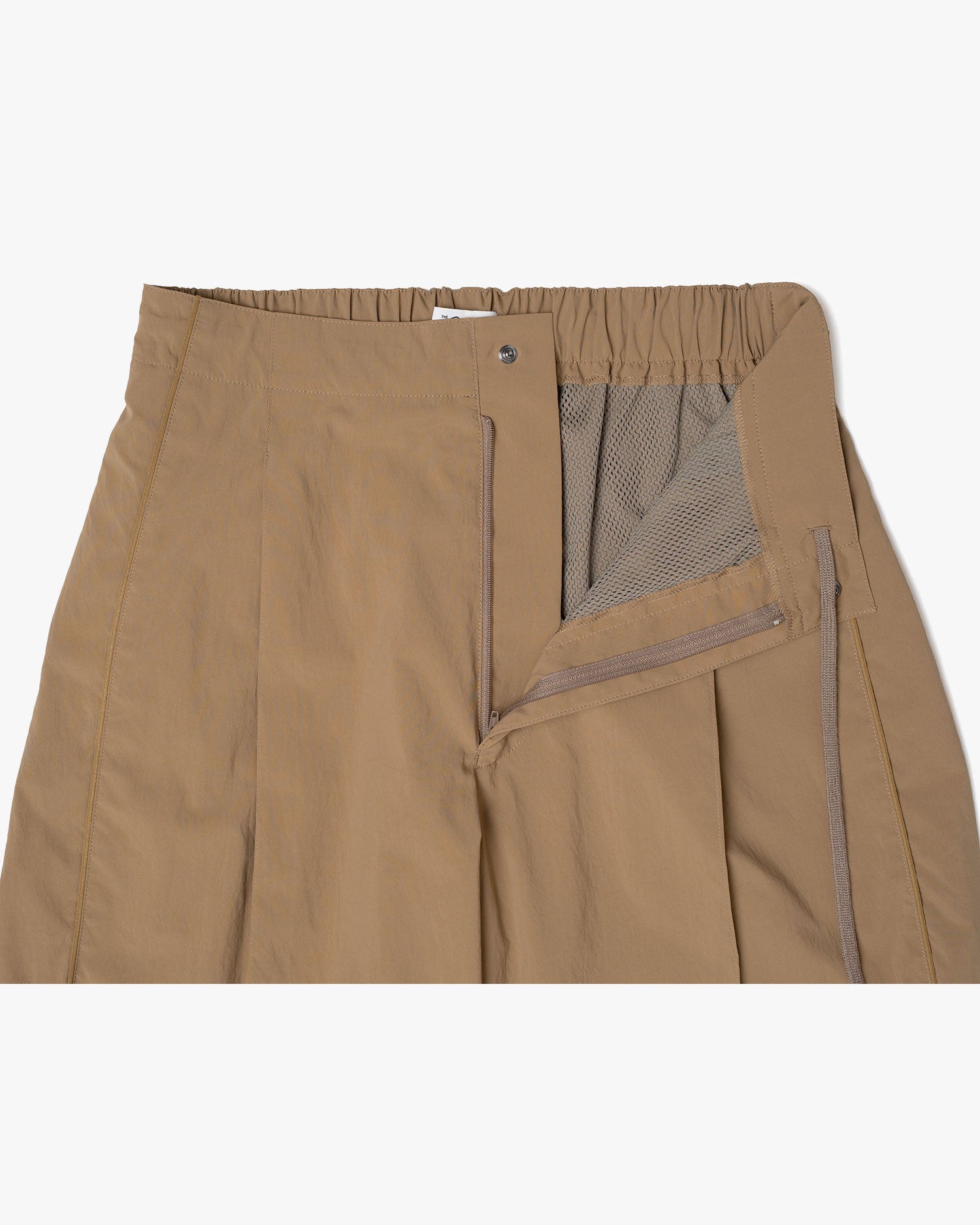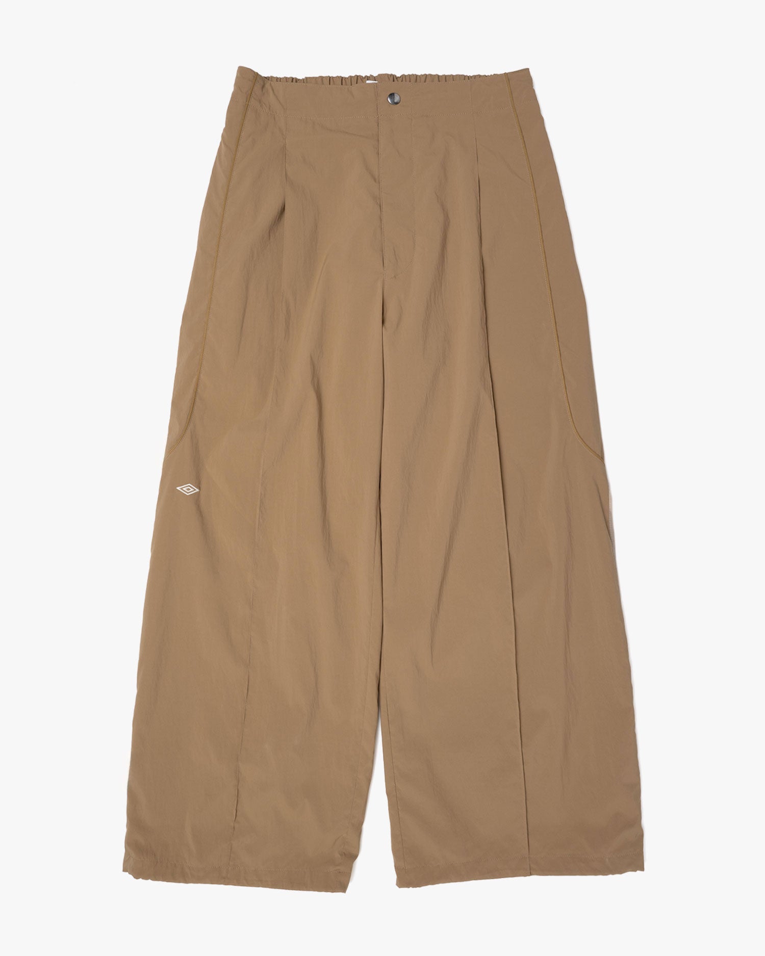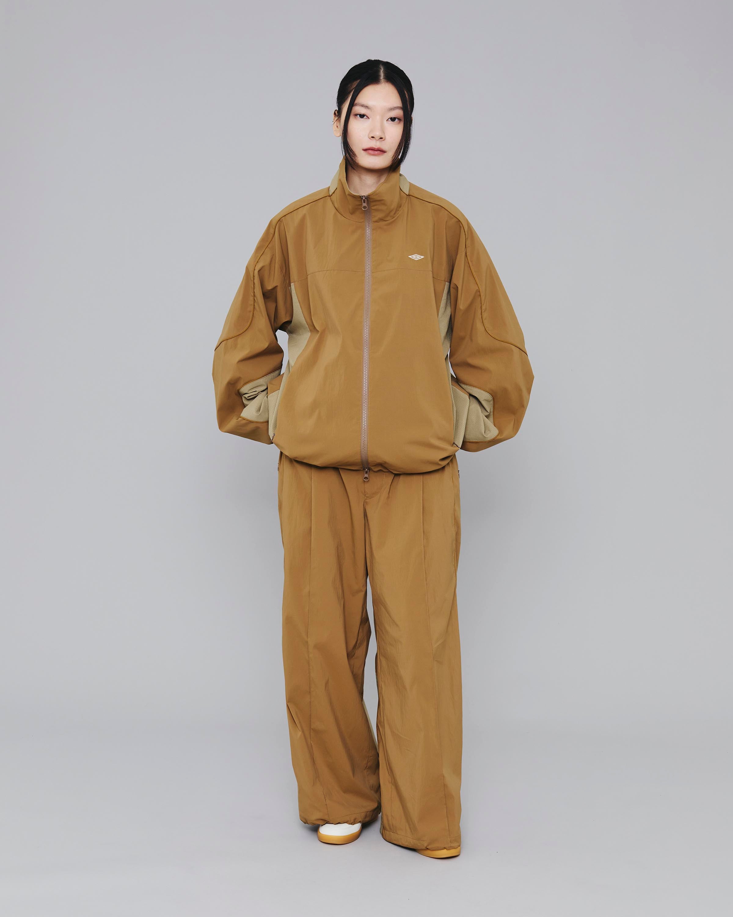 流線的なカッティングが特徴のトラックパンツ。光沢を抑えたスパンライクなポリエステル素材を使用し、スポーティでありながら上品な印象に仕上げました。ワイドテーパードシルエットながら、フロントのタックとセンタープリーツが美しいラインを演出。さらに、裾のドローコードでシルエットの変化を楽しめる、機能性とデザイン性を兼ね備えた一着です。