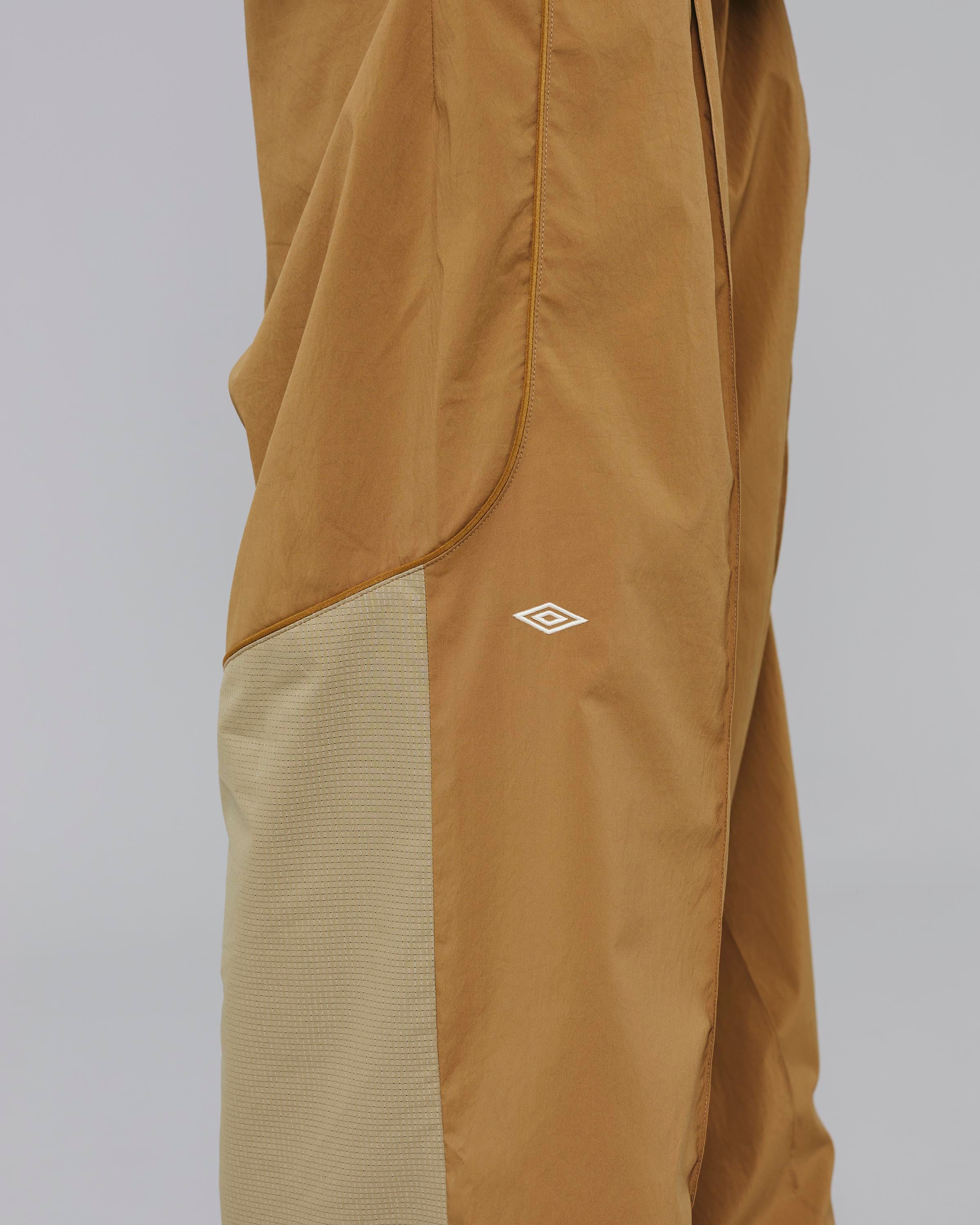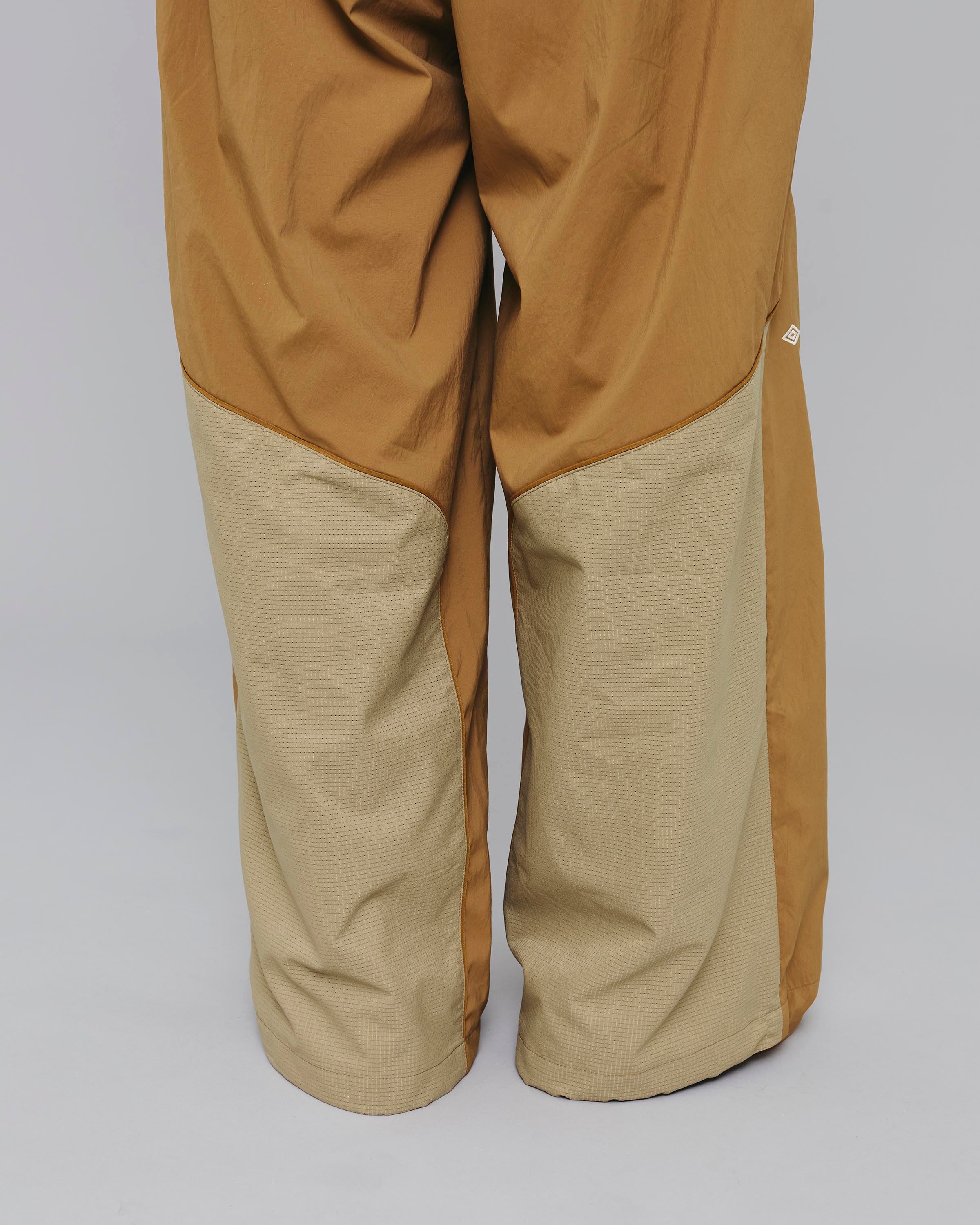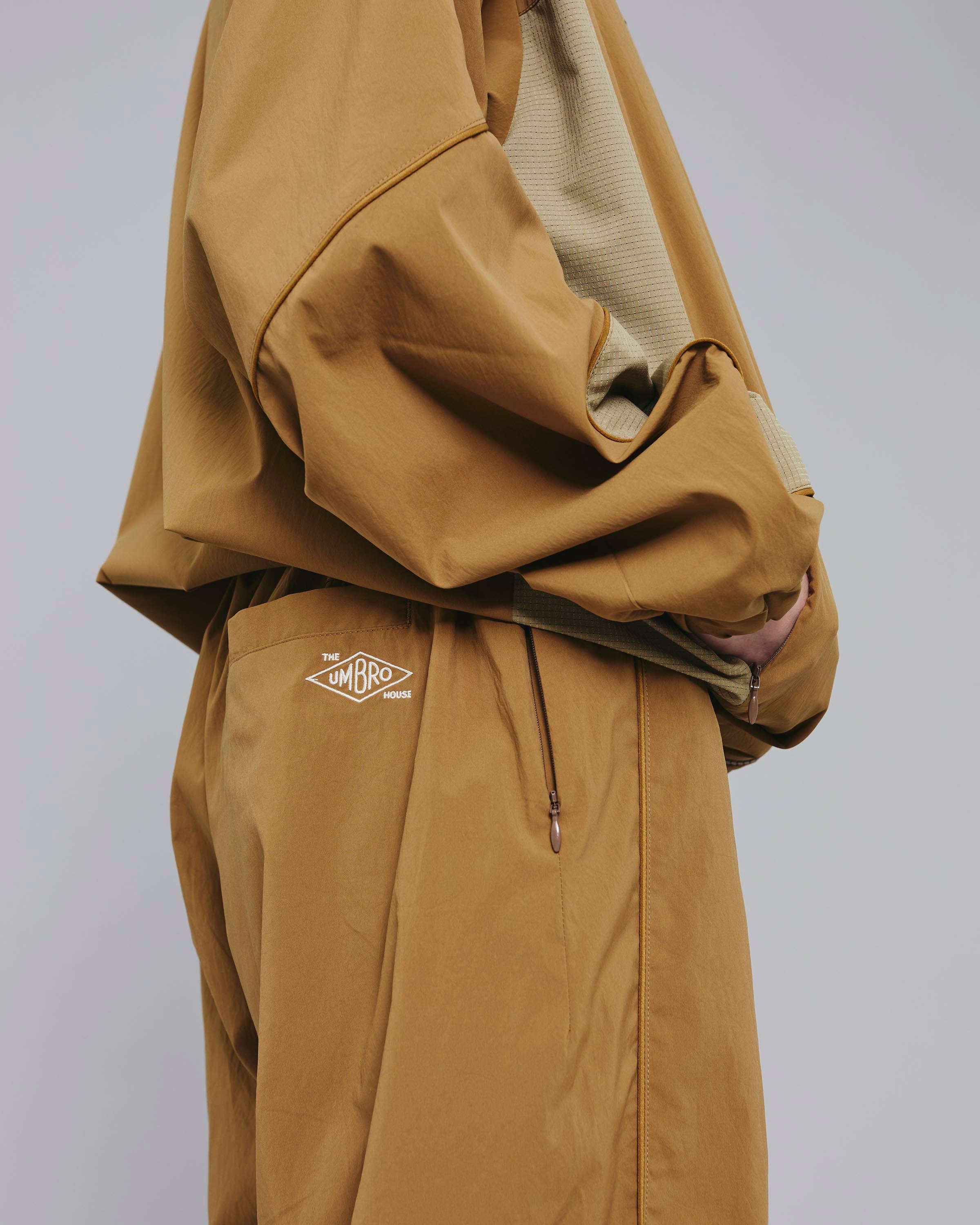 流線的なカッティングが特徴のトラックパンツ。光沢を抑えたスパンライクなポリエステル素材を使用し、スポーティでありながら上品な印象に仕上げました。ワイドテーパードシルエットながら、フロントのタックとセンタープリーツが美しいラインを演出。さらに、裾のドローコードでシルエットの変化を楽しめる、機能性とデザイン性を兼ね備えた一着です。