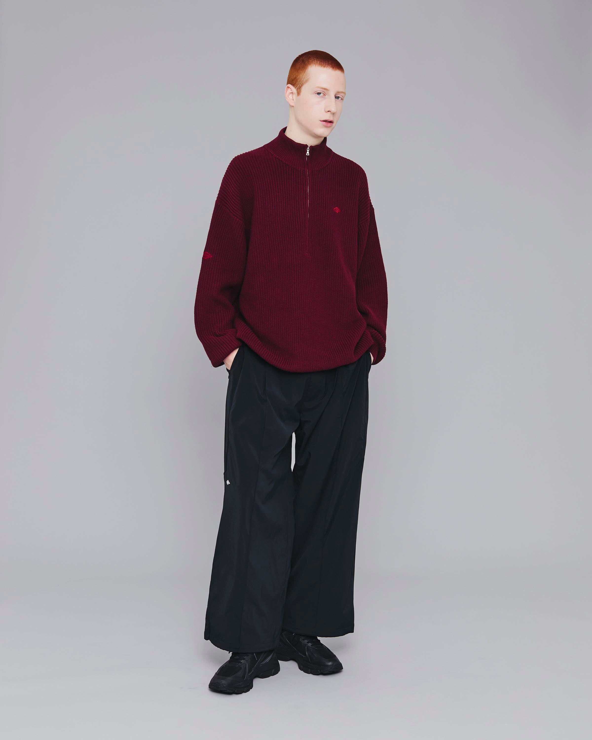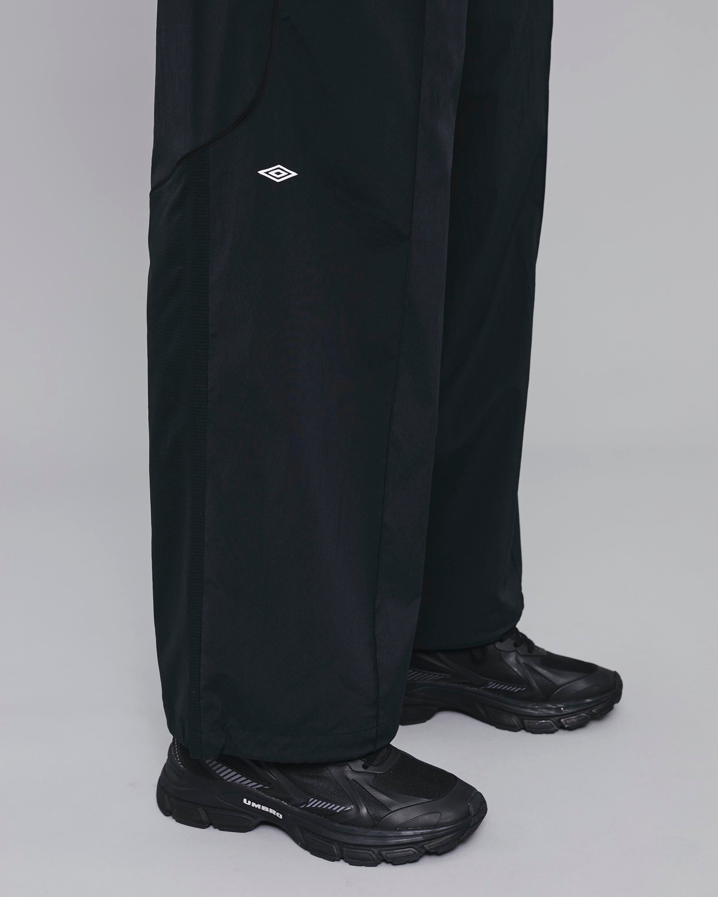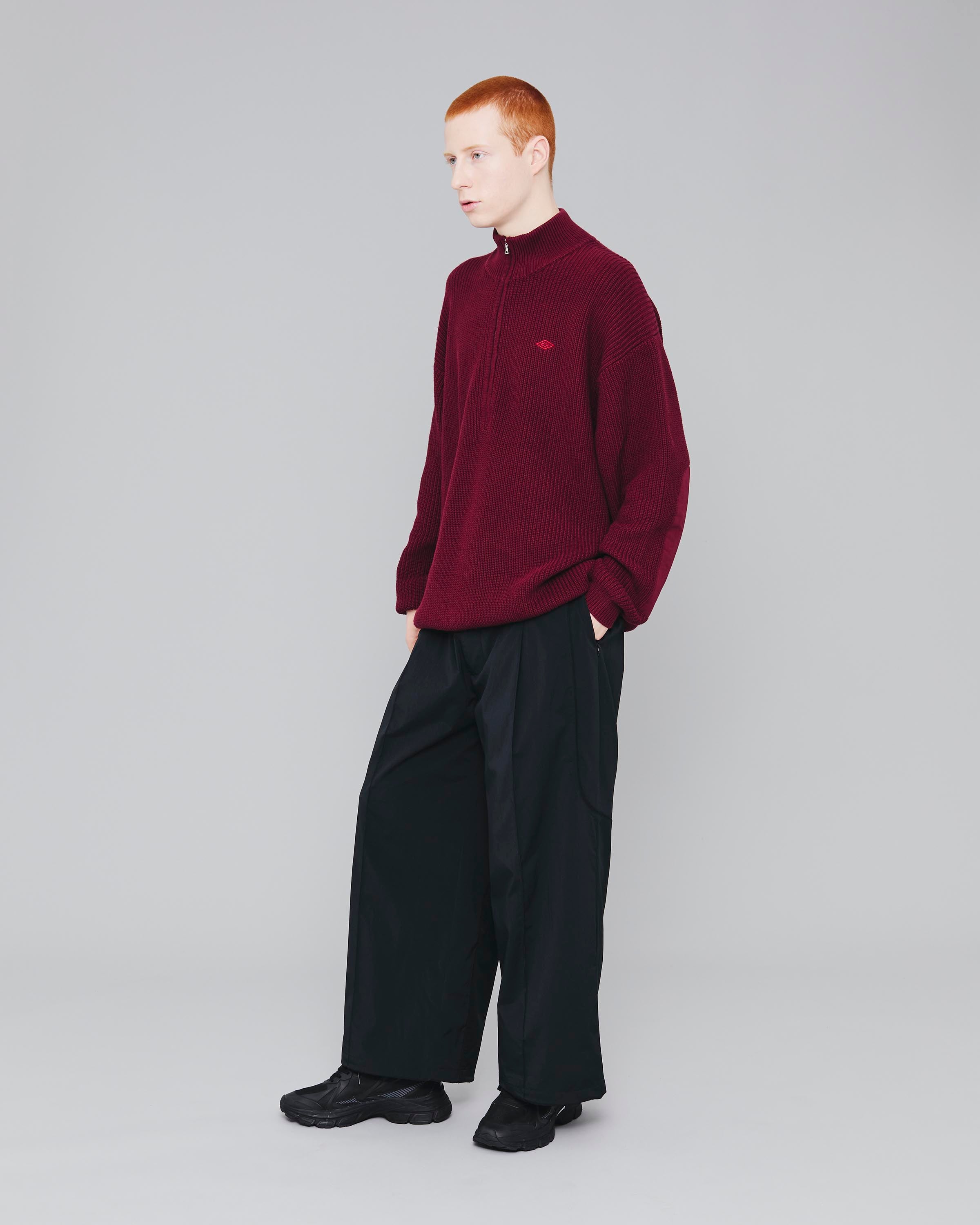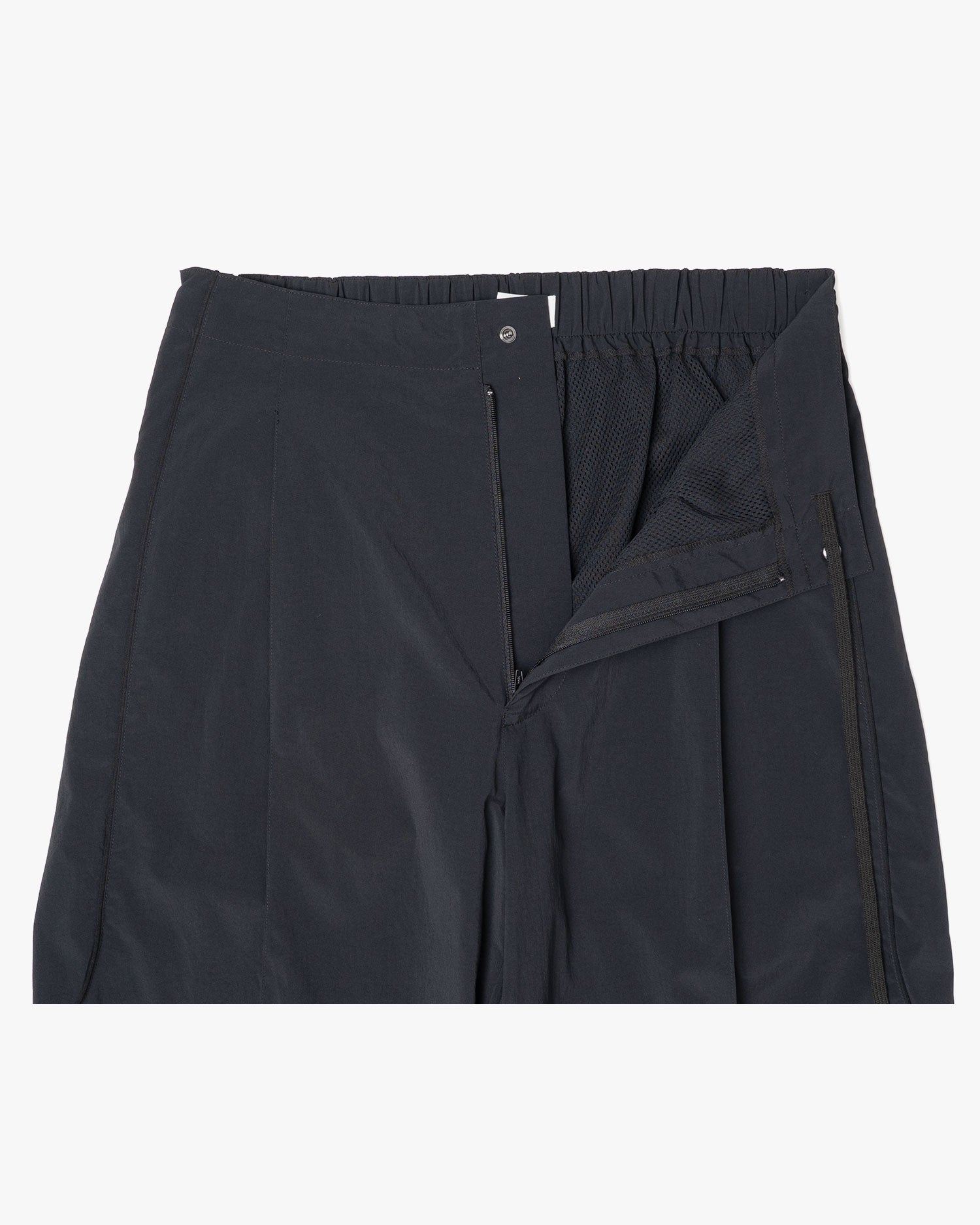 流線的なカッティングが特徴のトラックパンツ。光沢を抑えたスパンライクなポリエステル素材を使用し、スポーティでありながら上品な印象に仕上げました。ワイドテーパードシルエットながら、フロントのタックとセンタープリーツが美しいラインを演出。さらに、裾のドローコードでシルエットの変化を楽しめる、機能性とデザイン性を兼ね備えた一着です。
