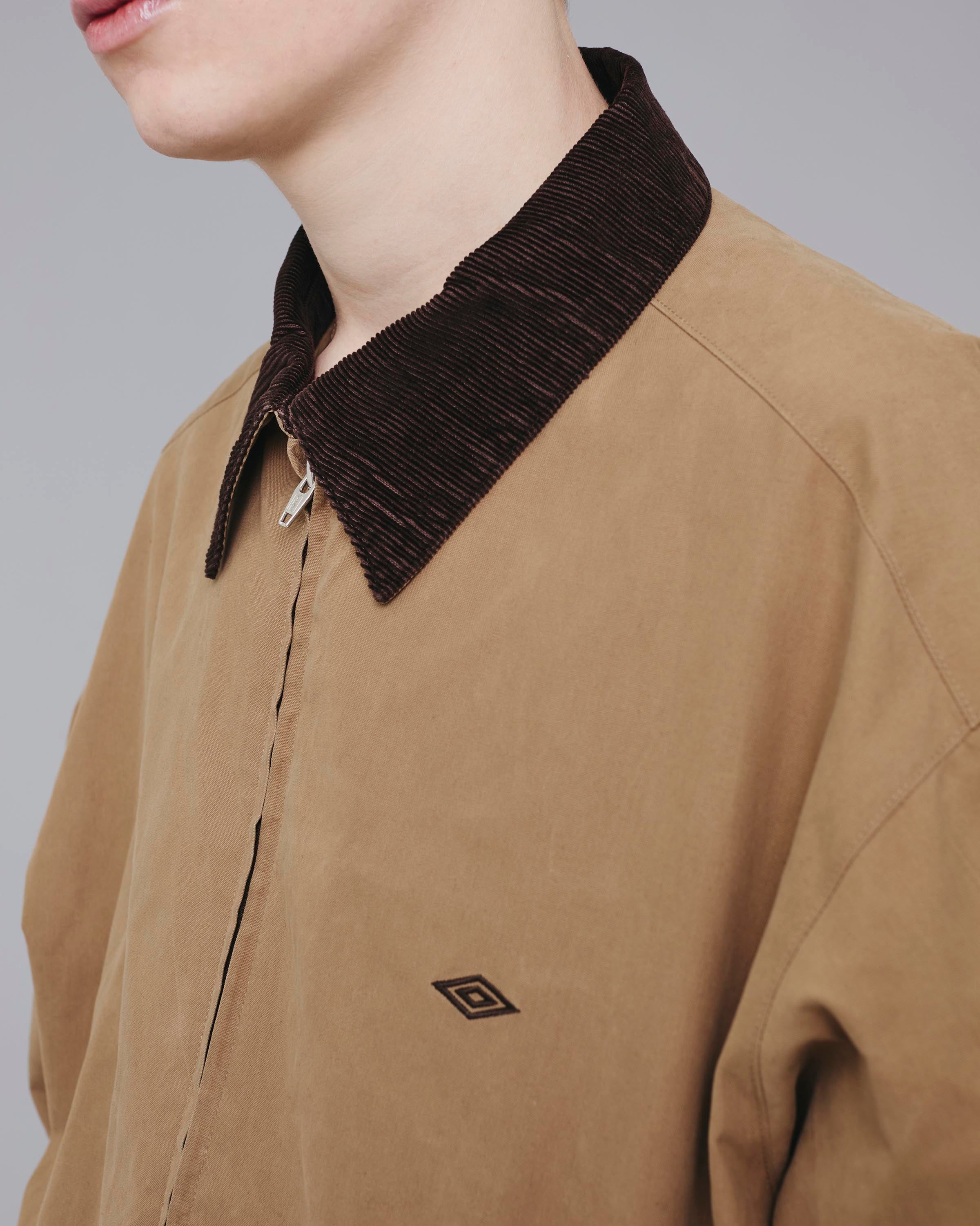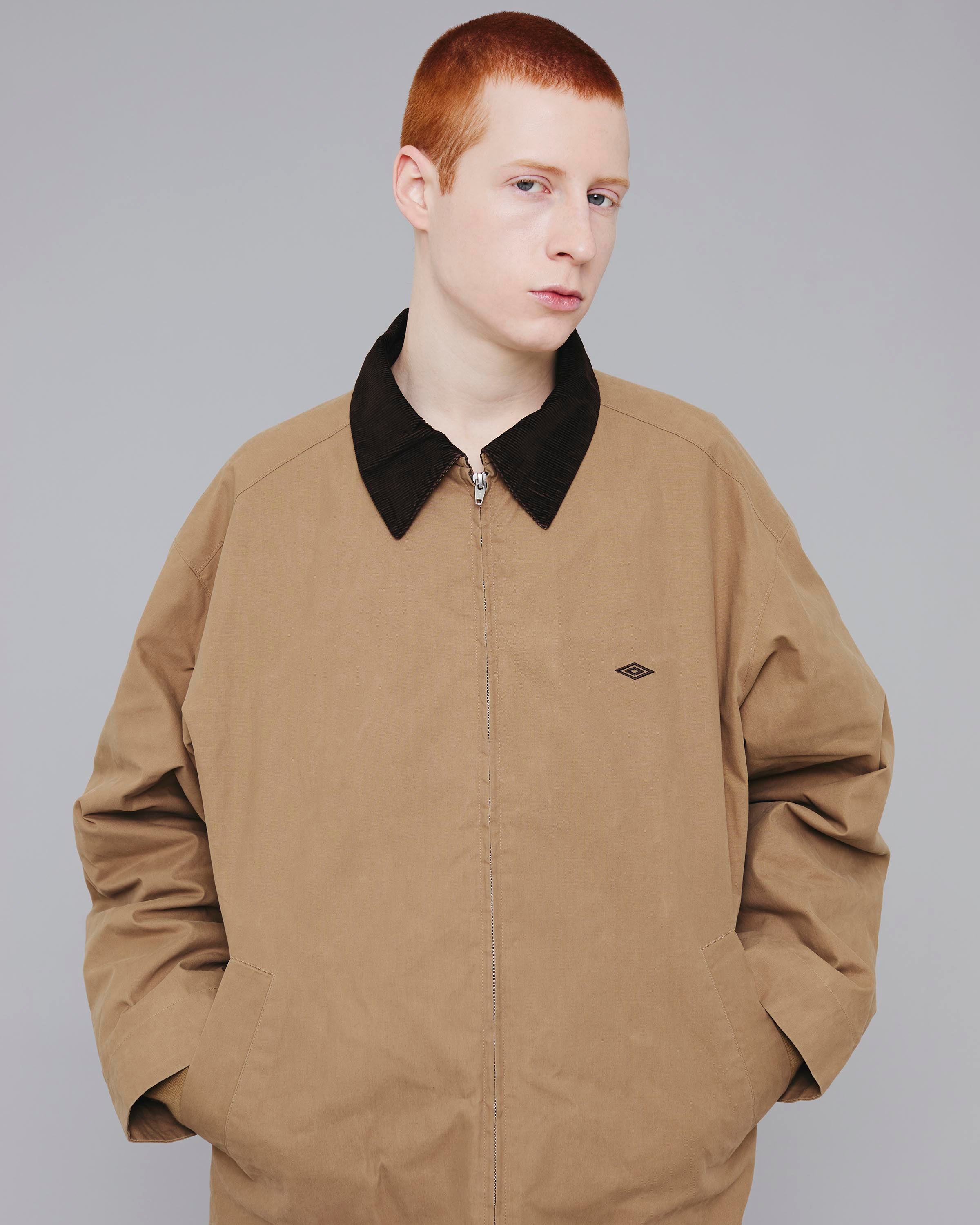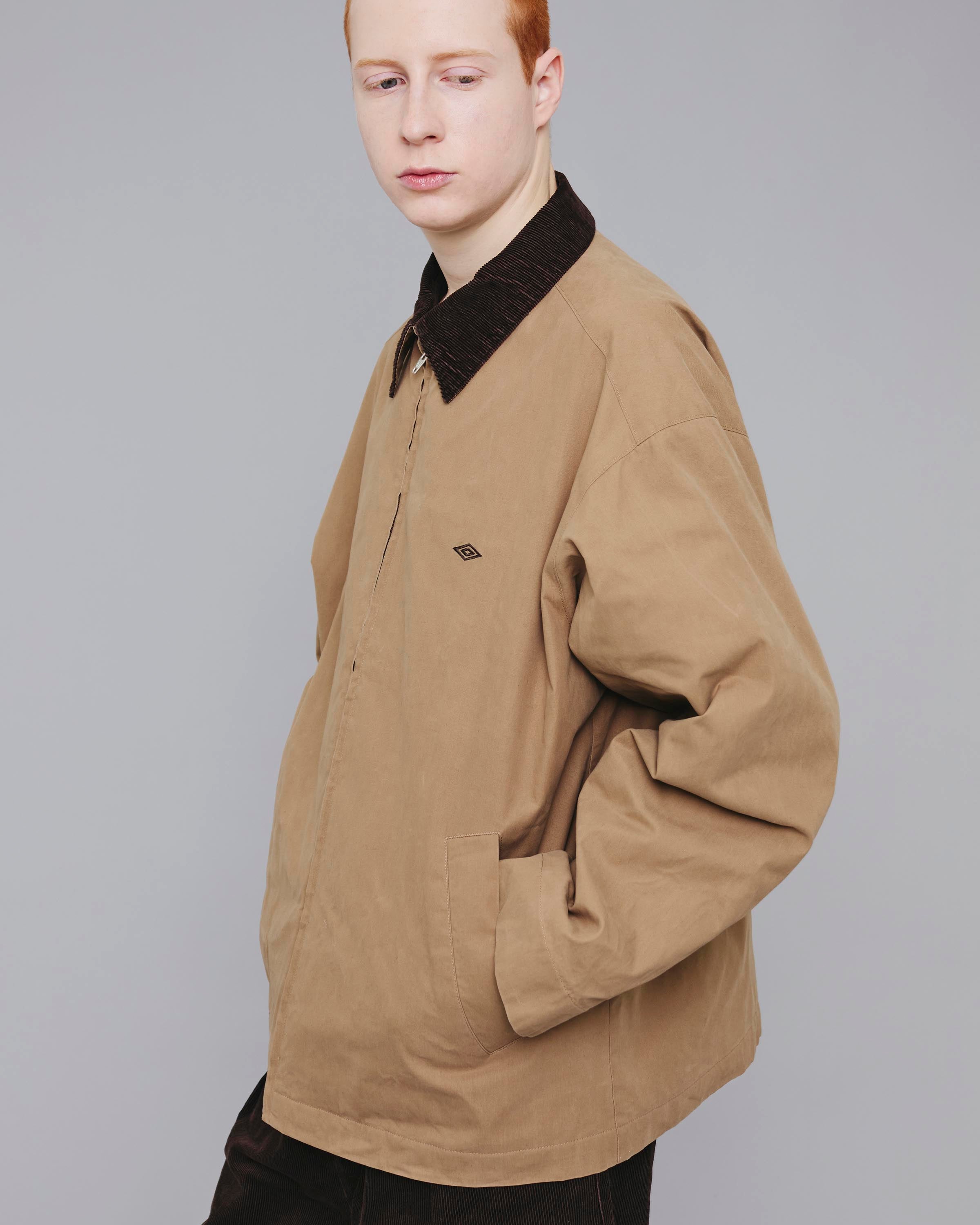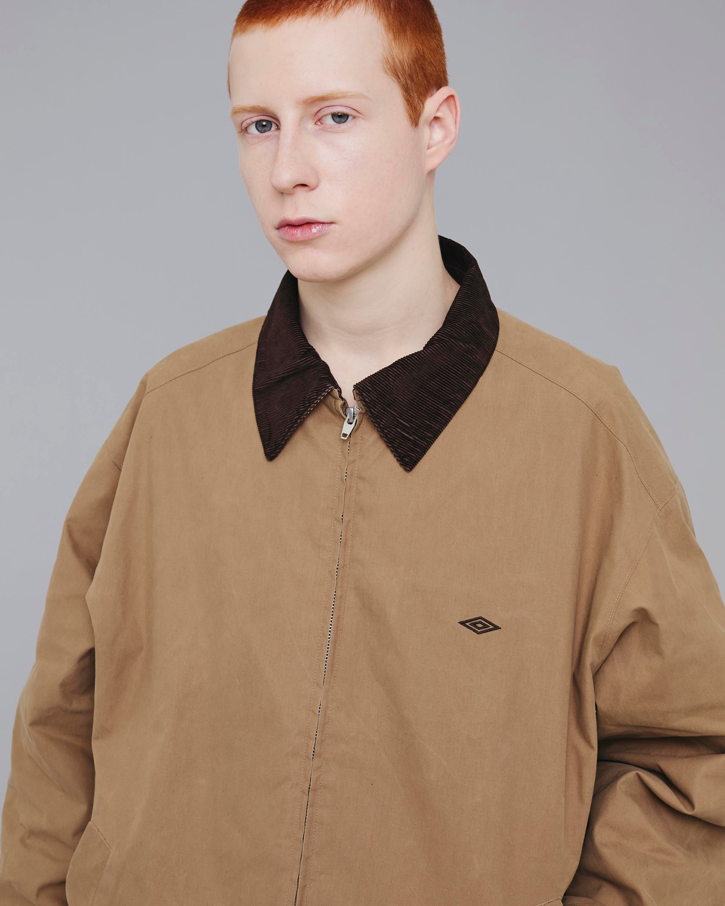 オイルドコットン素材に、襟部分にコーデュロイをアクセントとして配したブルゾンです。ワンウォッシュ加工を施すことで、独特の風合いを引き出しています。着丈はやや長めで、縦長のシルエットが特徴です。